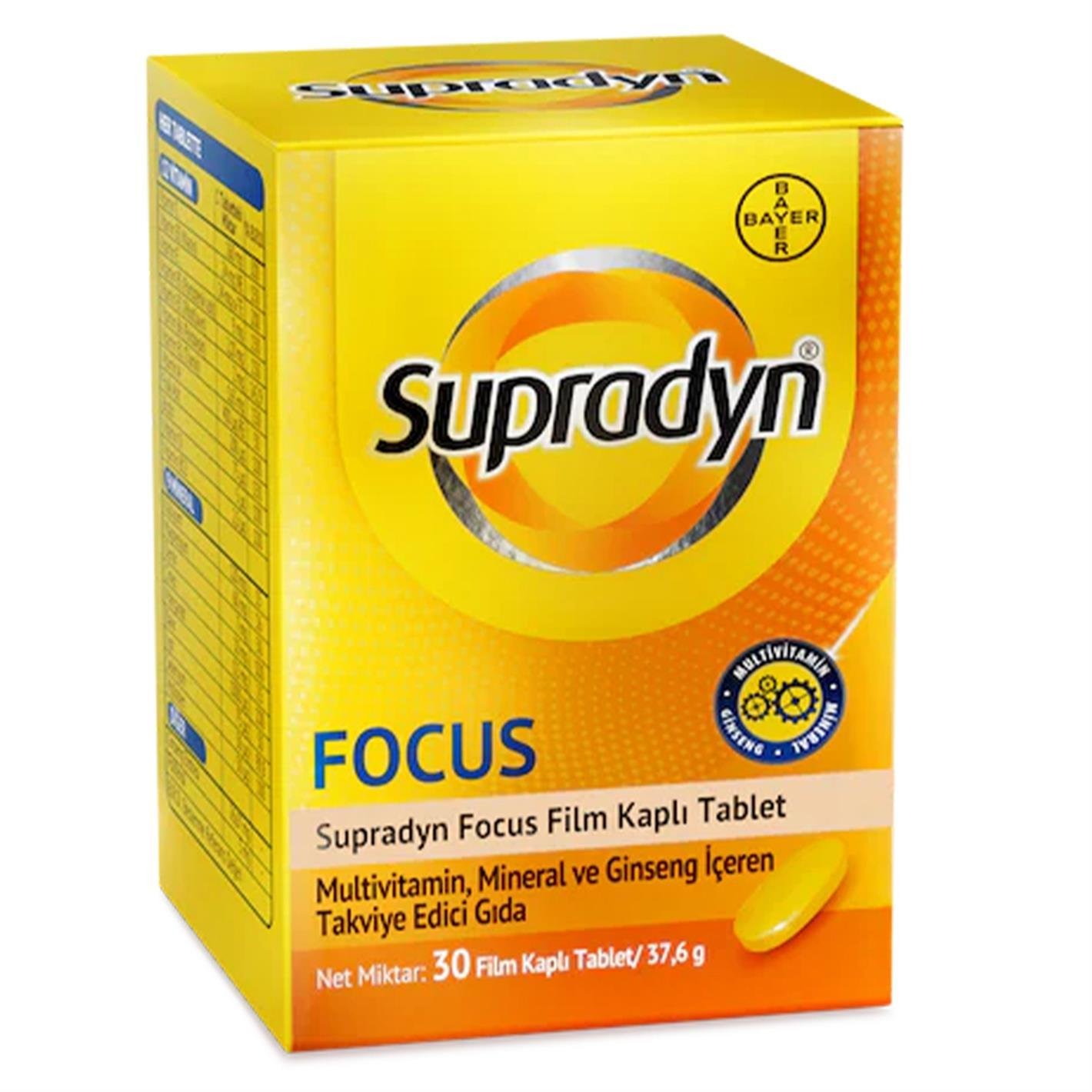 Supradyn® Focus, stresli geçen yoğun iş temposunda ve çalışma dönemlerinde size destek sağlar. İçeriğindeki B1, B2, B5, B6, B7, B12, C vitaminleri ve Demir, Kalsiyum, Bakır, İyot, Magnezyum, Mangan ile normal enerji oluşum metabolizmasına katkıda bulunur. İçeriğindeki B2, B3, B5, B6, B9, B12, C vitaminleri ve Demir, Magnezyum ile yorgunluk ve bitkinliğin azalmasına katkıda bulunur.