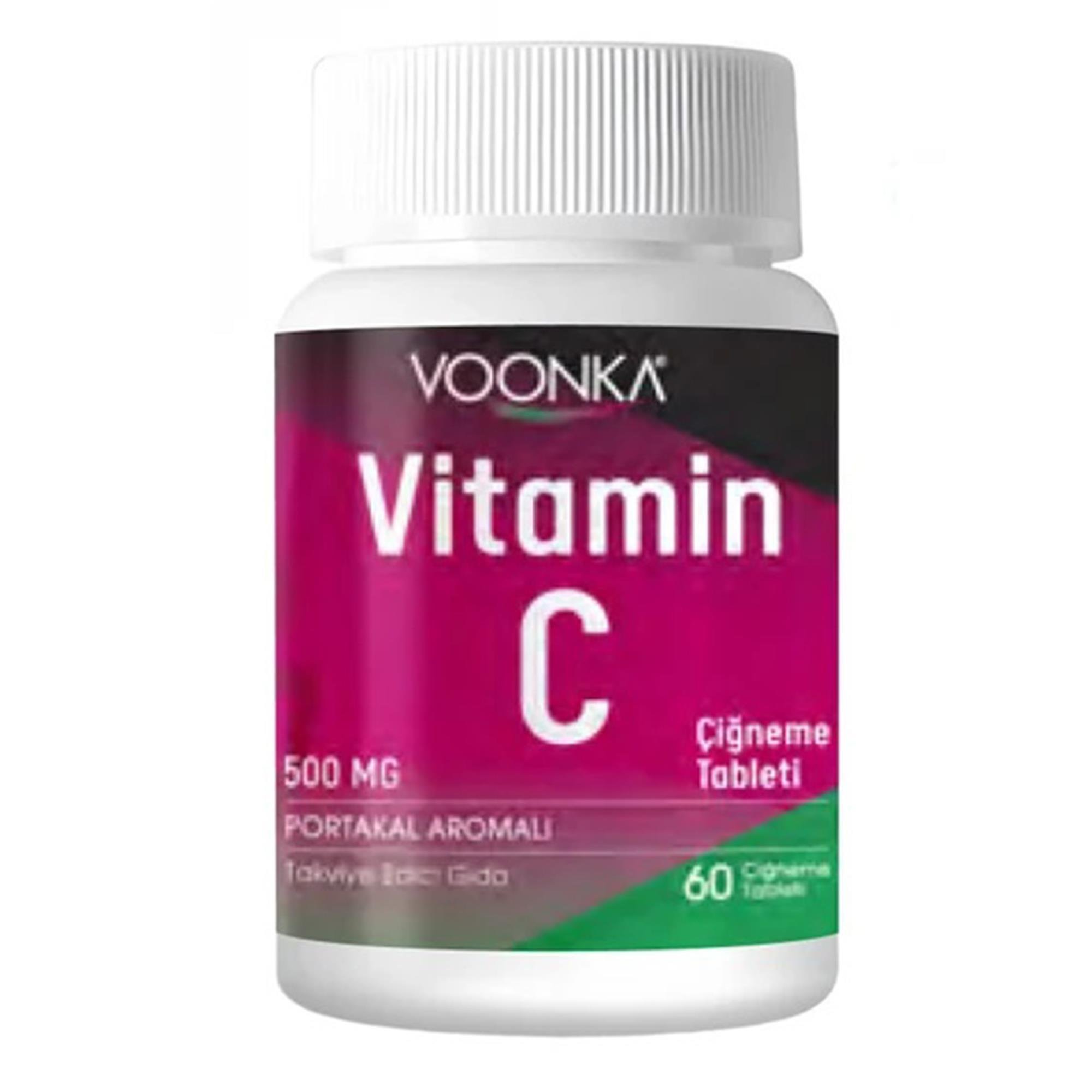 Ürün Adı: Voonka Vitamin C Portakal Aromalı 62 Çiğneme Tableti Ürün Markası: Voonka Ürün Boyutu: 62 Çiğneme Tableti Özet Bilgi: Portakal aromalı takviye edici gıda. Kullanım Şekli: Tavsiye Edilen Günlük Porsiyon: Yetişkinlerin günde 1 çiğneme tableti alması tavsiye edilir. Ürün Bileşimi: Taşıyıcı: mannitol, l-askorbik asit (Vitamin C), emülgatör: yağ asitlerinin magnezyum tuzları, aroma verici: portakal, tatlandırıcı: sukraloz Tatlandırıcı içerir. Yetişkinlerin kullanımına uygundur. Ürün Besin Değerleri: